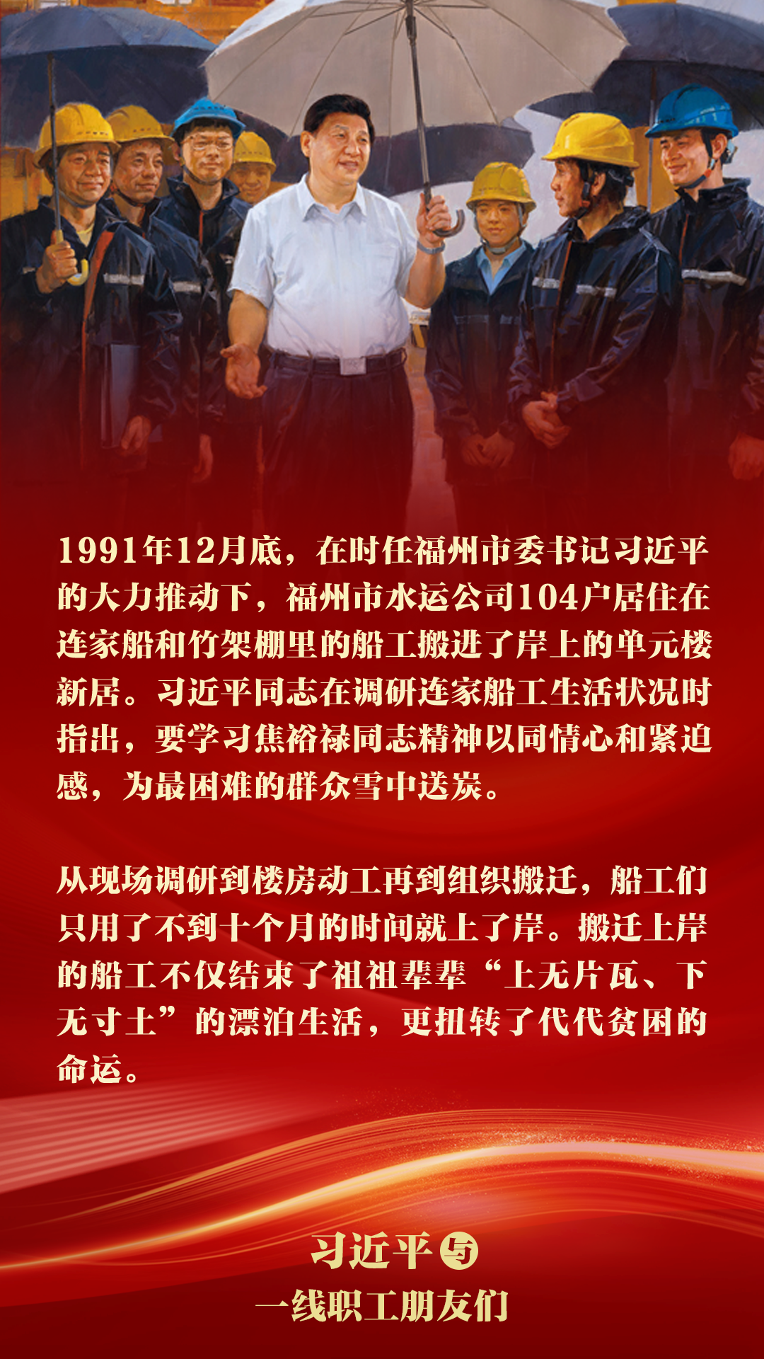 1991年12月底,在时任福州市委书记习近平的大力推动下,福州市水运公司104户居住在连家船和竹架棚里的船工搬进了岸上的单元楼新居。习近平同志在调研连家船工生活状况时指出,要学习焦裕禄同志精神以同情心和紧迫感,为最困难的群众雪中送炭。